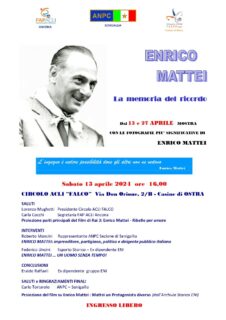 dopo il bell’incontro di sabato 23 marzo alle ACLI di Senigallia, sempre grazie ai bravi ed infaticabili Eraldo Raffaeli e Roberto Mancini, il prossimo 13 aprile torniamo ancora sull’indimenticabile Enrico Mattei.