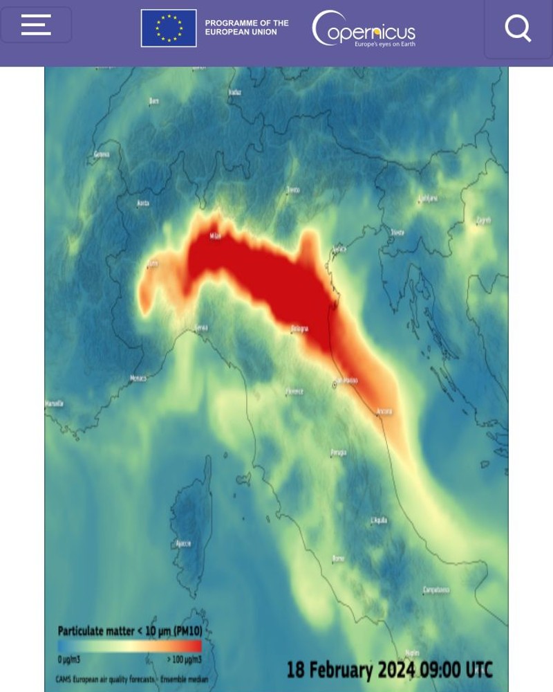 Mappa inquinamento rilevato a febbraio 2024 da Copernicus-ESA