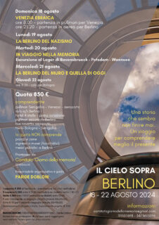 Il Comitato ‘Giorno della memoria’ di Senigallia, di cui fanno parte Comune, Diocesi di Senigallia, Comunità ebraica e Scuola di pace ‘Buccelletti’, promuove per i giorni 18 – 22 agosto prossimi ‘Il cielo sopra Berlino’, un viaggio di conoscenza storica e culturale con diverse tappe molto interessanti e significative.