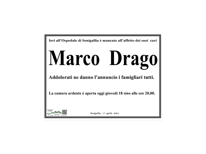 Ieri all’ospedale di Senigallia è mancato all’affetto dei suoi cari Marco Drago.