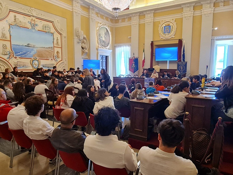La Sala consiliare “G. Orciari” del Palazzo comunale di Senigallia gremita di studenti, studentesse delle scuole medie superiori e inferiori della città, con i loro docenti e dirigenti scolastici, autorità civili e militari, rappresentanti delle associazioni e cittadini.