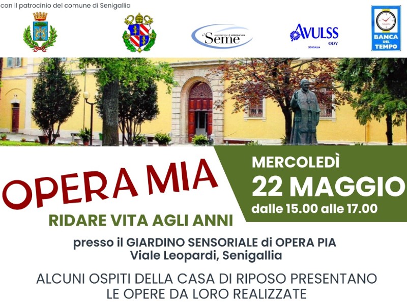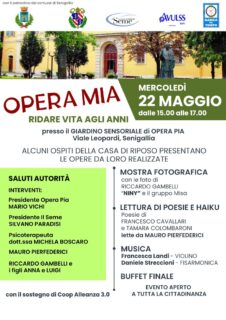 “Opera mia. Ridare vita agli anni”. Un titolo importante per il pomeriggio che si terrà mercoledì 22 maggio presso il Giardino sensoriale dell’Opera Pia, in viale Leopardi a Senigallia a partire dalle 15.