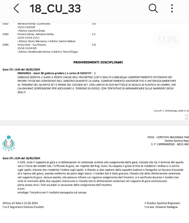 Sentenza di omologazione di US Pallavolo Senigallia - Gabicce Gradara