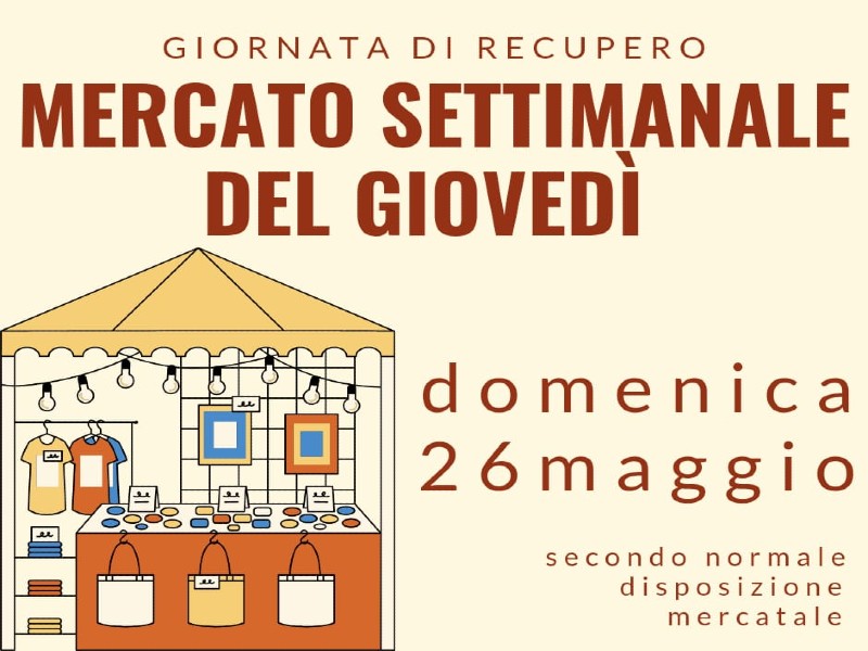 Domenica 26 maggio si svolgerà il mercato cittadino con le medesime disposizioni del mercato del giovedì.