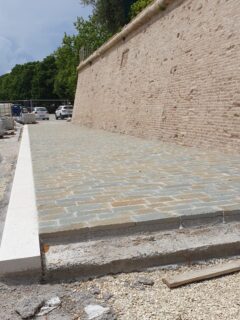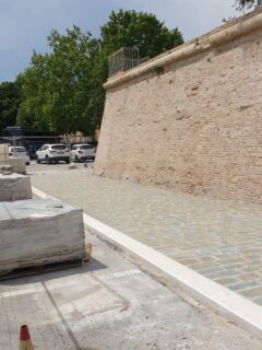 Invece è stata progettata la costruzione di un inutile e costoso marciapiedi alto 20 cm, largo più di 3 metri, come se ci si trovasse al lato una strada di quartiere, mentre è solo un’area adibita a parcheggio. Questo basamento, perché tale è, riduce la monumentalità delle mura, introducendo un elemento estraneo che le appiattisce e le banalizza. Inoltre il colore della pietra usata crea un evidente contrasto con il mattone della scarpa. In sostanza l’effetto prodotto è del tutto opposto a quello da noi sempre auspicato e più che esaltare, sminuisce e marginalizza il complesso delle mura.