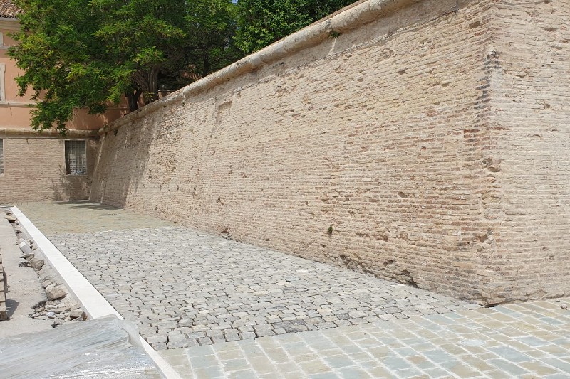 Questo suggerimento purtroppo non è stato mai (o quasi mai) preso in considerazione ed un esempio recente è quello dei giardini Catalani, dove il riporto di terra ha affossato ancora di più le mura. Si sperava che in occasione di questo nuovo intervento sull’area dell’ex pesa si adottasse una soluzione più coerente con il concetto di valorizzazione, ad esempio realizzando alla base delle mura una fascia di rispetto a prato o tutt’al più a selciato, conservandone il livello esistente o addirittura abbassandolo seppure di poco. Il verde sicuramente era la soluzione più auspicabile, perché avrebbe creato uno stacco mettendo maggiormente in risalto il laterizio delle mura.