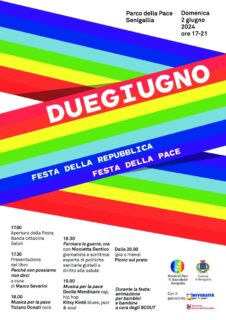 Festa della Repubblica=Festa della PaceLa festa si aprirà alle ore 17 con il tradizionale saluto della banda Città di Senigallia e avrà come ospite Nicoletta Dentico, giornalista e scrittrice esperta di politiche sanitarie globali e diritto alla salute. Da diversi anni è parte del comitato degli esperti della Scuola di Pace di Senigallia.