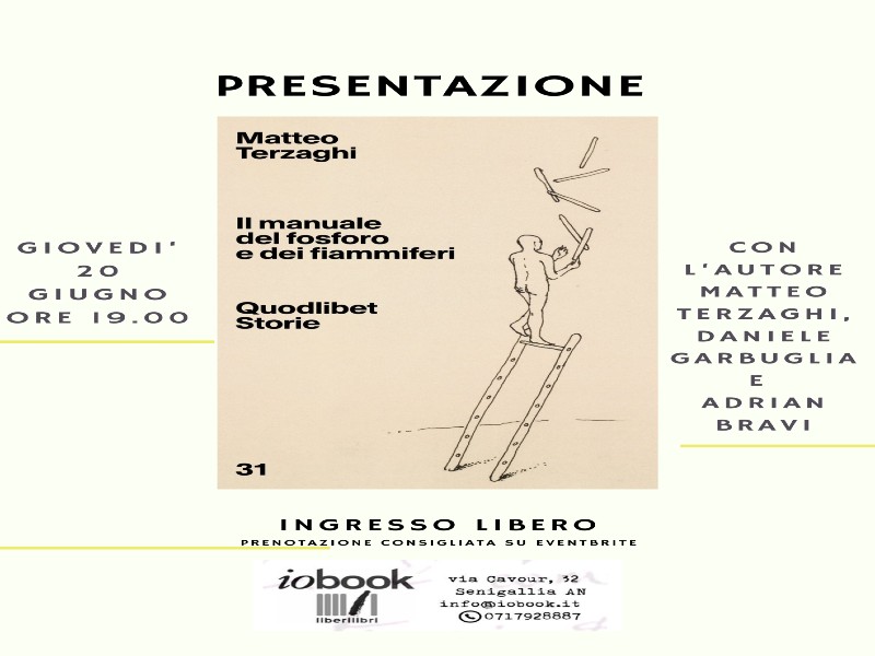 Daremo inizio agli incontri estivi con la presentazione del libro “Il manuale del fosforo e dei fiammiferi” di Matteo Terzaghi, pubblicato da Quodlibet nella collana storie. Matteo sarà intervistato da Daniele Garbuglia e Adrian Bravi (reduce dall’esperienza del premio Strega con il bellissimo libro “Adelaida”).