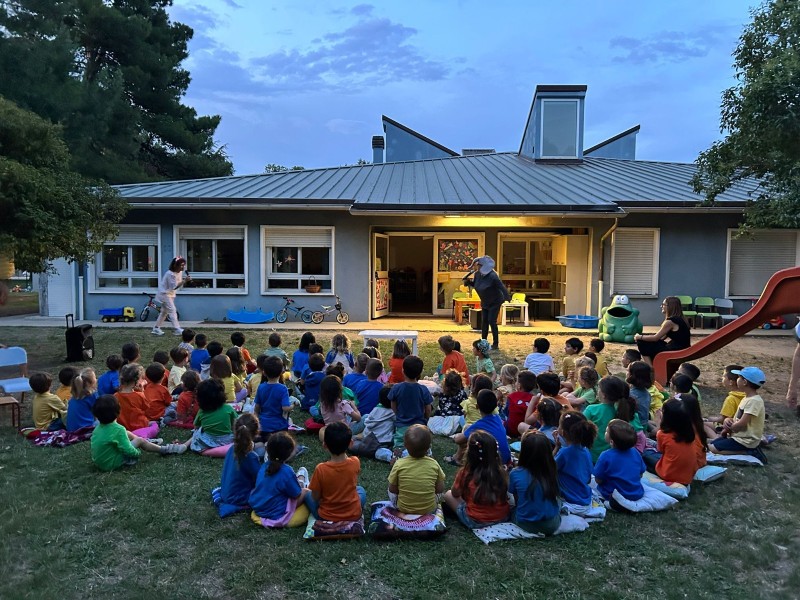 In occasione delle letture al tramonto, un appuntamento fisso dopo il covid, la scuola era allestita come il set di un film: lanterne nel giardino, luci tra gli alberi, candele nel vialetto d’ingresso, tavoli e cuscini: tutto era pronto per stimolare la fantasia dei piccoli alunni tra i 3 e i 6 anni.