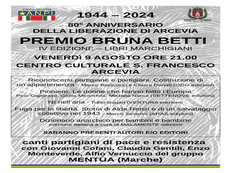 Venerdì 9 agosto alle ore 21.00, nel suggestivo chiostro del Centro culturale San Francesco di Arcevia, in occasione delle commemorazioni per l’80° anniversario della liberazione del territorio arceviese dal nazifascismo, si terrà la serata conclusiva del Premio letterario “Bruna Betti”, organizzato dalla locale sezione ANPI e patrocinato dall’Amministrazione comunale.