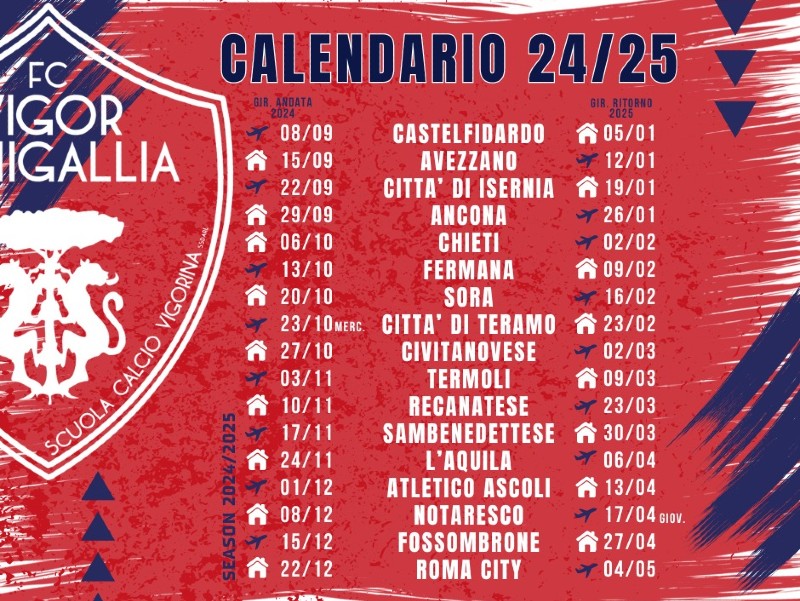 Ma gli scontri con le altre marchigiane saranno solo all’inizio: la Vigor Senigallia, oltre a Castelfidardo e Ancona sarà infatti attesa dai match contro Fermana, Civitanovese, Recanatese, Sambenedettese, Atletico Ascoli, Fossombrone. Nel girone anche cinque abruzzesi: oltre al già citato Avezzano, Chieti, Teramo, L’Aquila, Notaresco; le molisane Isernia e Termoli, le laziali Sora e Roma City, nel cui impianto si chiuderà il campionato della Vigor Senigallia.