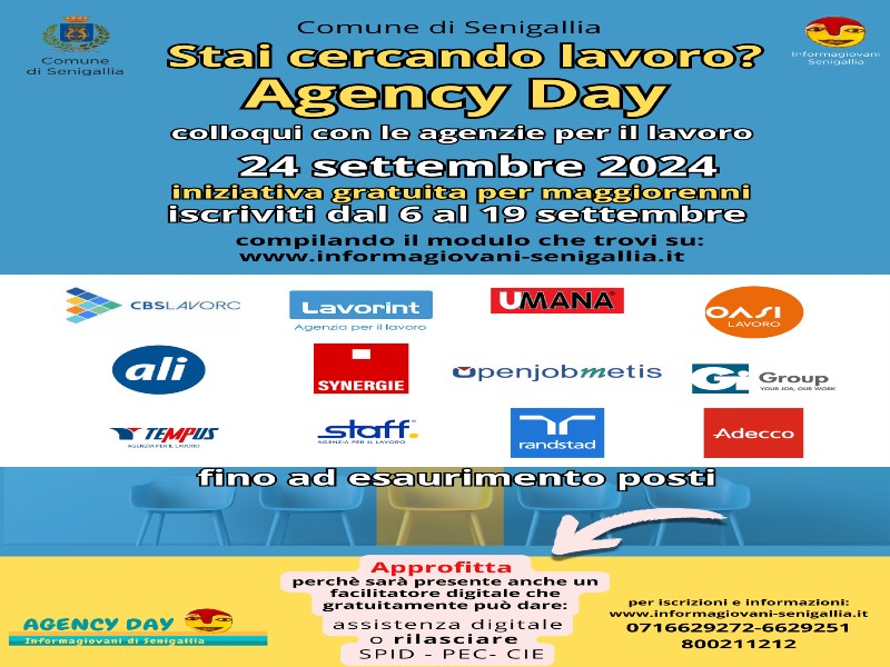 Torna AGENCY DAY, sesta edizione, la giornata dedicata al lavoro organizzata dall’Informagiovani del Comune di Senigallia, durante la quale le Agenzie per il Lavoro e i candidati avranno la possibilità di incontrarsi gratuitamente, per colloqui di lavoro individuali.