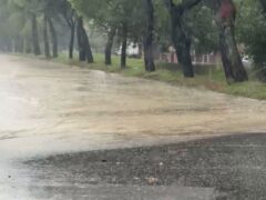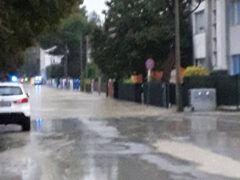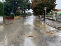 Allagamenti in corso su viale dei Pini: la strada è invasa dalle acque che escono dai tombini accanto al fosso Sant’Angelo fino all’incrocio con via Mercantini e via delle Genziane, poi l’acqua sta “svoltando” verso sud in direzione di via delle Genziane.