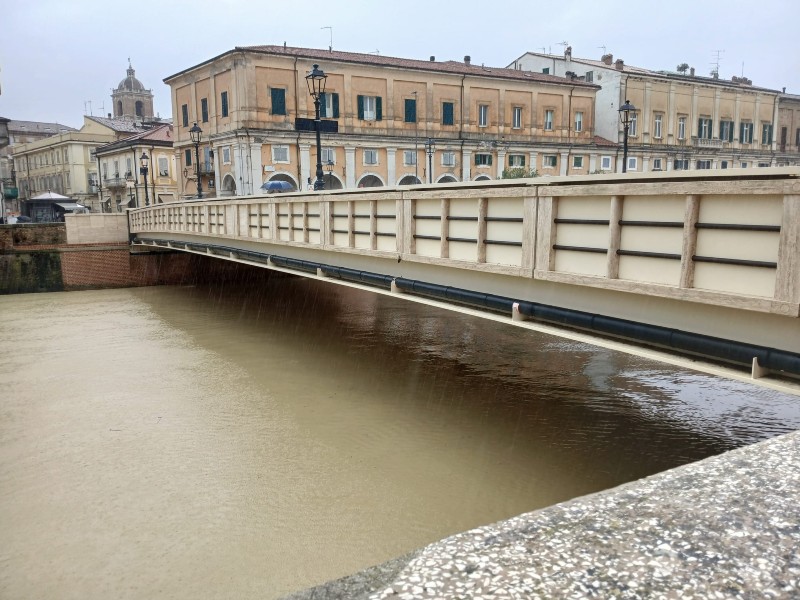 La situazione del fiume Misa in centro a Senigallia, all’altezza del ponte Angeli dell’8 dicembre 2018. Lungo via XX Settembre le attività commerciali non hanno aperto in seguito all’allerta meteo arancione.