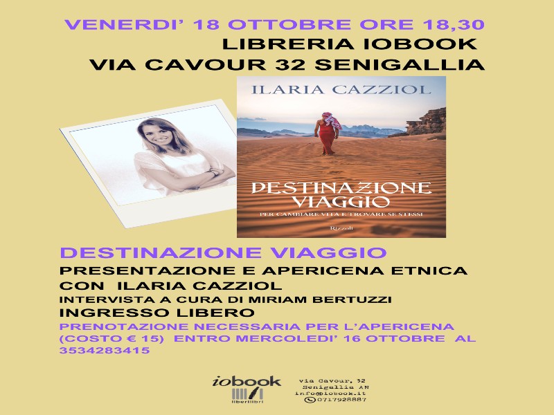 Venerdì 18 ottobre alle 18,30 presso la libreria iobook, Ilaria Cazziol parlerà del suo libro “Destinazione viaggio” (Rizzoli 2024) con Miriam Bertuzzi.