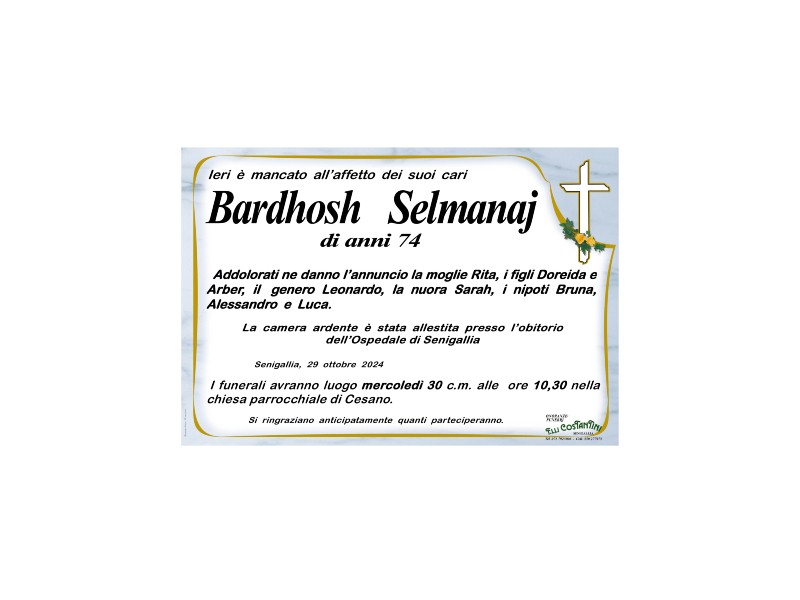 Ieri è mancato all’affetto dei suoi cari Bardhosh Selmanaj di anni 74.