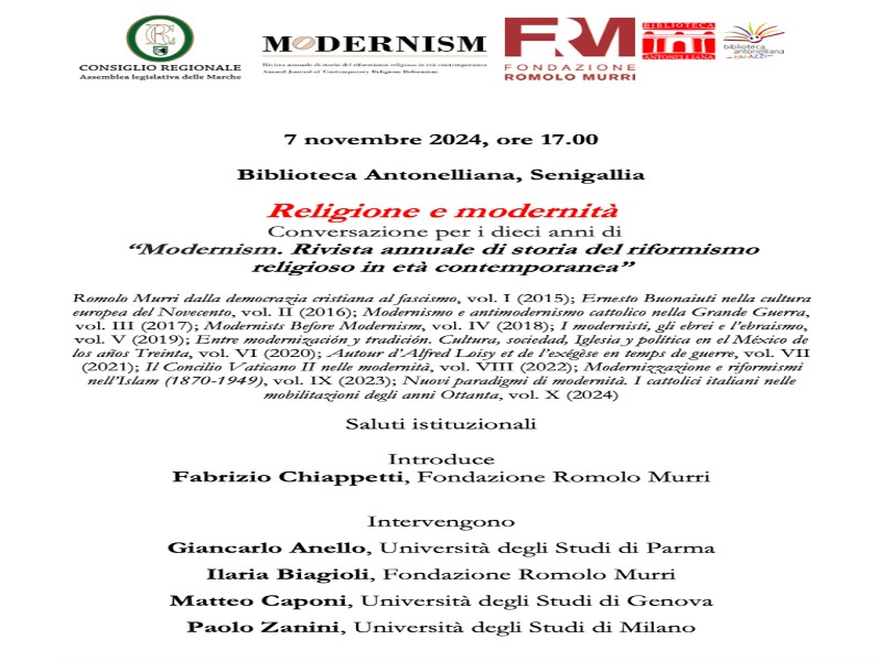 L’iniziativa, promossa dalla Fondazione Murri di Urbino, prende spunto dal decennale della pubblicazione di “Modernism”, rivista annuale di storia del riformismo religioso in età contemporanea. Nata per dare continuità alla precedente esperienza di “Fonti e Documenti”, la nuova rivista della Fondazione urbinate è divenuta un punto di riferimento nell’ambito degli studi storici e religiosi. Introdurrà la conversazione Fabrizio Chiappetti (Fondazione Murri). Sono previsti gli interventi di Giancarlo Anello (Università di Parma), Ilaria Biagioli (Fondazione Murri), Matteo Caponi (Università di Genova) e Paolo Zanini (Università di Milano).