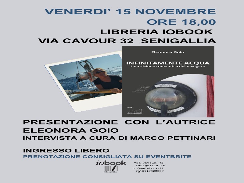 Venerdì 15 novembre alle 18,00 presso la libreria iobook, Eleonora Goio presenterà il libro “Infinitamente acqua. Una visione romantica del navigare” (Calibano 2023) in dialogo con Marco Pettinari.