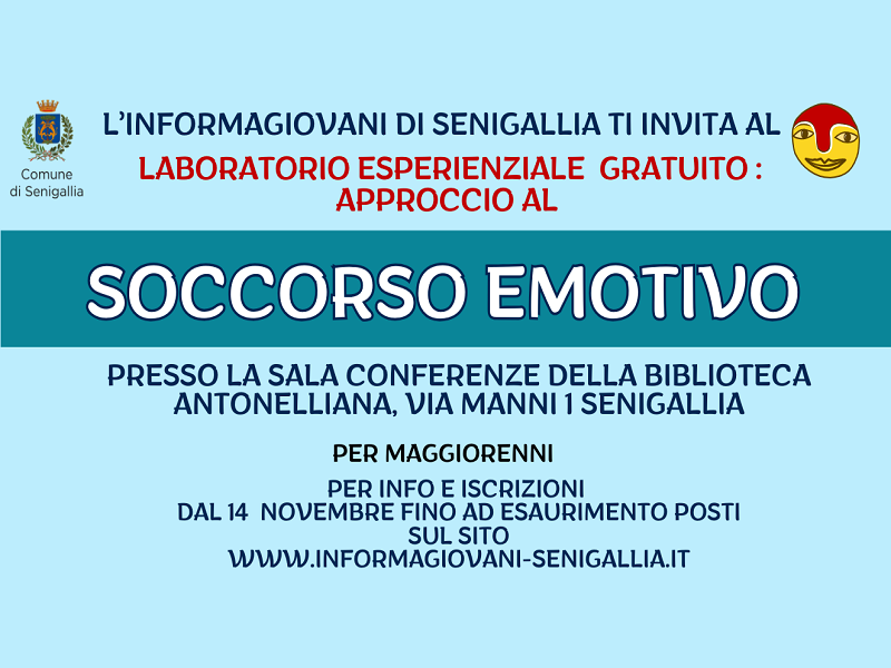 Avrà inizio lunedì 2 dicembre, il Laboratorio esperienziale gratuito “Soccorso emotivo”, organizzato dall’Informagiovani del Comune di Senigallia, presso la sala conferenze della Biblioteca Antonelliana.