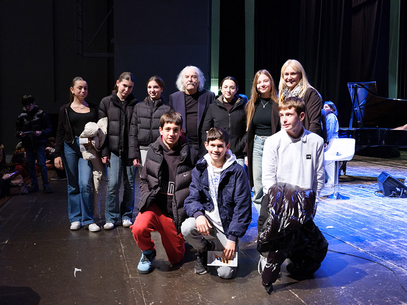 Enrico Rava con alcuni alunni dell'Istituto Comprensivo Senigallia Centro e la prof.ssa maestra Elena Solai