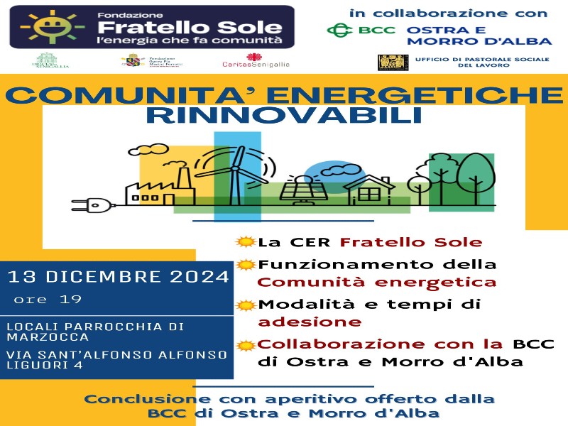 CER, un nuovo acronimo che racchiude una sfida sempre più attuale, quella del reperimento sostenibile delle fonti energetiche; di questo si parlerà venerdì 13 dicembre 2024, alle ore 19:00, in un incontro promosso dalla “Fondazione Fratello Sole” e “BCC Ostra e Morro d’Alba” presso i locali parrocchiali di Marzocca.