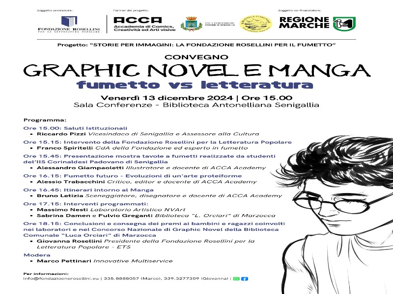 La Fondazione Rosellini per la Letteratura Popolare, con il patrocinio del Comune di Senigallia, è lieta di presentare il convegno “Graphic Novel e Manga: fumetto vs letteratura”, che si terrà venerdì 13 dicembre 2024, alle ore 15.00, presso la Sala Conferenze della Biblioteca Antonelliana di Senigallia.