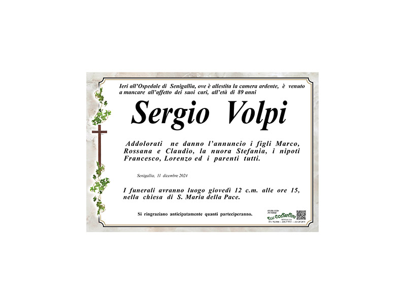 Ieri all’Ospedale di Senigallia, ove è allestita la camera ardente, è venuto a mancare all’affetto dei suoi cari, all’età di 89 anni Sergio Volpi.