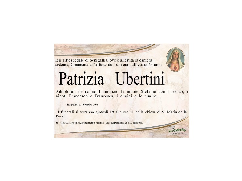 Ieri all’ospedale di Senigallia, ove è allestita la camera ardente, è mancata all’affetto dei suoi cari all’età di 64 anni Patrizia Ubertini.