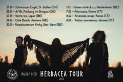 Dopo il successo del primo tour e gli ottimi riscontri avuti sul web con i loro singoli, i Maison Dieu trio Doom rock Senigalliese torna sulle scene con un nuovo tour Europeo seguito dalla pubblicazione del nuovo ep “Herbacea” prodotto grazie alla recente firma con l’etichetta discografica “Sliptrick Records”.