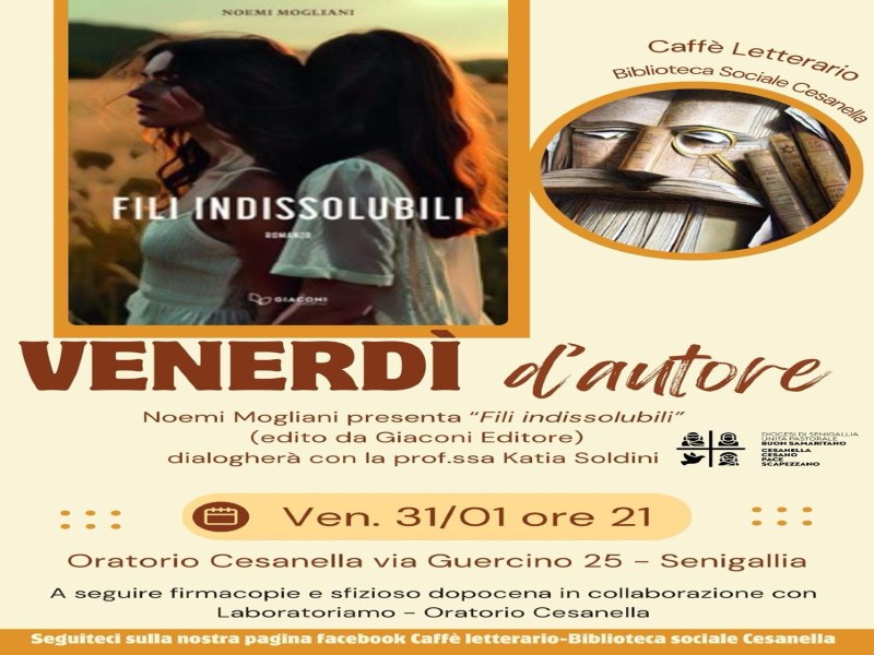 Il Caffè Letterario-Biblioteca sociale Cesanella promuove una serata culturale con la partecipazione della scrittrice recanatese NOEMI MOGLIANI che presenta il suo secondo romanzo “Fili indissolubili” edito da Giaconi editore, in dialogo con la prof.ssa Katia Soldini.