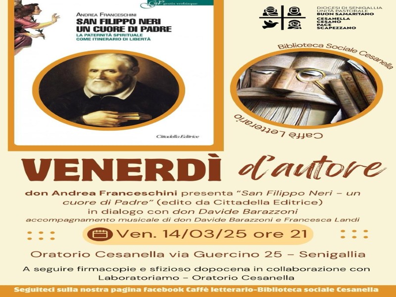 l Caffè Letterario-Biblioteca sociale Cesanella organizza l’evento ” Venerdì d’autore” con un autore speciale. Il parroco dell’Unità Pastorale Buon Samaritano Don Andrea Franceschini presenta il suo libro,