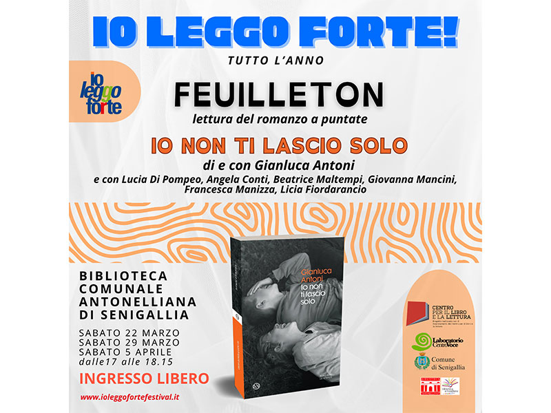 Il feuilleton o romanzo d’appendice consiste, semplicemente, in un romanzo pubblicato a puntate su un periodico o su una rivista. Alcuni grandi classici della letteratura europea sono stati insospettabilmente romanzi a puntate e solo una volta terminati sono stati pubblicati anche in versione completa. I lettori del LaboratorioCentroVoce Lucia Di Pompeo, Beatrice Maltempi, Angela Conti, Giovanna Mancini, Francesca Manizza, Licia Fiordarancio e l’autore stesso leggeranno ad alta voce il romanzo “IO NON TI LASCIO SOLO” dello scrittore senigalliese Gianluca Antoni al fine di creare suspense nei lettori e fidelizzarli, così come avveniva per il Feuilleton. Tre sono gli appuntamenti previsti: sabato 22 marzo, sabato 29 marzo e sabato 5 aprile con orario 17-18.15.
