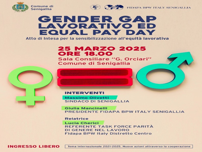 In occasione del mese dedicato ai diritti delle donne, Senigallia promuove un impegno significativo per l’eliminazione delle discriminazioni di genere che penalizzano fortemente le donne anche nel mondo del lavoro. Per questo martedi 25 marzo alle ore 18, presso la Sala Consiliare “G. Orciari” della residenza Municiapale di Senigallia il Sindaco Massimo Olivetti e la Presidente della Fidapa BPW Italy di Senigallia Giulia Mancinelli sottoscriveranno un Atto di Intesa “per promuovere congiuntamente azioni concrete di sensibilizzazione verso la popolazione, le categorie economiche e le imprese, sull’equità lavorativa tra uomini e donne e l’Equal Pay Day”. L’Atto d’Intesa si concretizzerà nei prossimi mesi attraverso l’organizzazione congiunta di eventi pubblici e progetti specifici sull’equità salariale, sulla conoscenza dell’Equal Pay Day (il giorno indetto dalla Commissione Europea a partire dal quale ogni anno le donne lavorano gratis e che nel 2024 è coinciso con il 15 novembre) e sulle buone pratiche volte a ridurre e possibilmente ad eliminare il gender gap nel mondo del lavoro per le donne. La firma dell’Atto d’Intesa sarà preceduta dall’intervento dell’avv. Lucia Cherici, Referente Task Force Fidapa Distretto Centro “Parità di genere nel lavoro”. L’evento è aperto al pubblico e sono invitati a partecipare cittadini, categorie economiche e imprese.