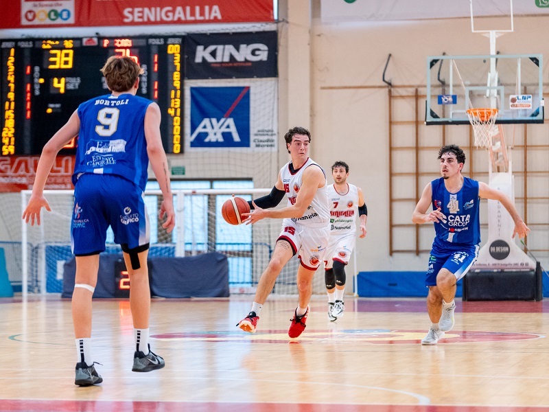 Landoni apre il terzo periodo con una tripla, Pescara va un po’ in affanno, la rotazione è troppo breve (un solo giocatore per il cambio) e i biancorossi danno avvio alla personale scalata, interrotti dalla difesa e dalle giocate di Cambria, in forma smagliante e avversario così pericoloso da tentare e mettere un canestro da oltre la metà campo proprio sul suono della sirena, che fischia così sul 69-59. L’ultimo periodo è un’escalation della Pallacanestro Senigallia, un canestro dietro l’altro di Tommaso Maiolatesi, protagonista anche di un bel recupero insieme a Sablich, e poi l’ingresso di Cristiano Perna, già sceso in campo nel terzo periodo, di Nicolò Gentili che infila serenamente una tripla e di Francesco Valenti, i giovani del vivaio della Goldengas che riescono tutti a concludere con i loro primi punti in serie B.
