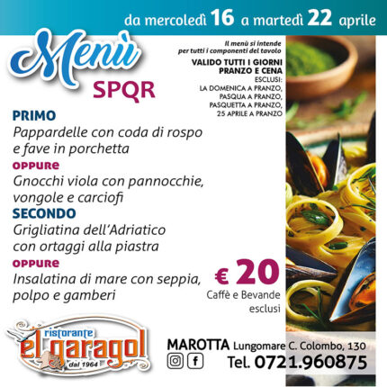 Con menù creativi e una vista mozzafiato sull’azzurro mare Adriatico, El Garagol promette di deliziare i sensi di tutti i suoi ospiti. Lo farà per tutto febbraio con il menù Sarà un pesce d’aprile…?, ma anche con il menù settimanale SPQR. Scopriamo insieme tutte le proposte del ristorante di Marotta di Mondolfo.