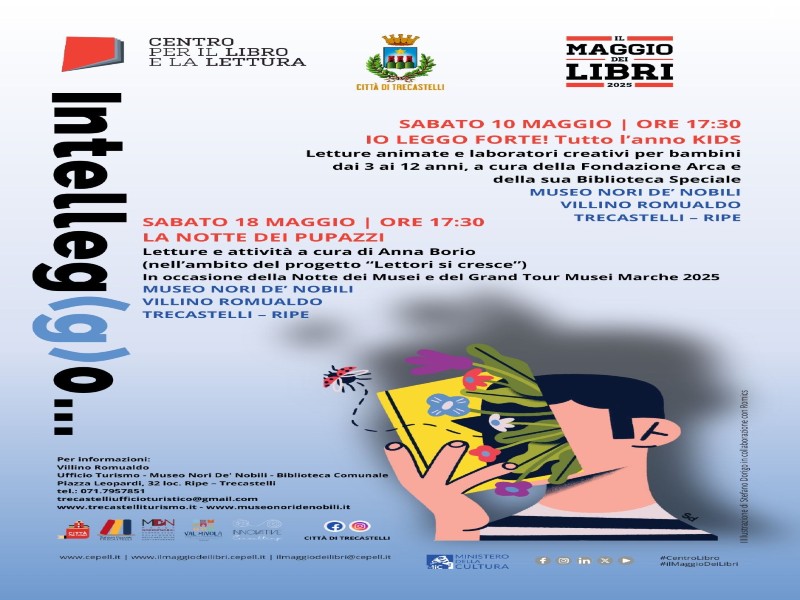 In questo contesto, la Biblioteca Comunale di Trecastelli propone due iniziative in programma per l’edizione 2025. Sabato 10 maggio, dalle 17:00 alle 18:30, nell’ambito del progetto IO LEGGO FORTE!, si è svolto l’evento “Emozioniamoci e Conosciamoci”. Rivolto a bambini dai 3 ai 12 anni, l’incontro ha offerto letture animate e laboratori creativi sul tema delle emozioni, a cura della Fondazione Arca e della sua Biblioteca Speciale. L’attività, gratuita e inclusiva, ha utilizzato la modalità del circle time per stimolare ascolto, espressione e consapevolezza emotiva. Inoltre, sabato 17 maggio, alle 17:30, si terrà La Notte dei Pupazzi presso il Museo Nori De’ Nobili, nel Villino Romualdo a Ripe di Trecastelli. Questo evento, che fa parte del progetto Lettori si cresce, prevede letture e attività creative condotte da Anna Borio. L’iniziativa si inserisce nella Notte dei Musei e nel Grand Tour Musei Marche 2025, offrendo ai partecipanti un’opportunità di esplorazione culturale e ludica, con il libro come protagonista. Tutte le attività sono gratuite.