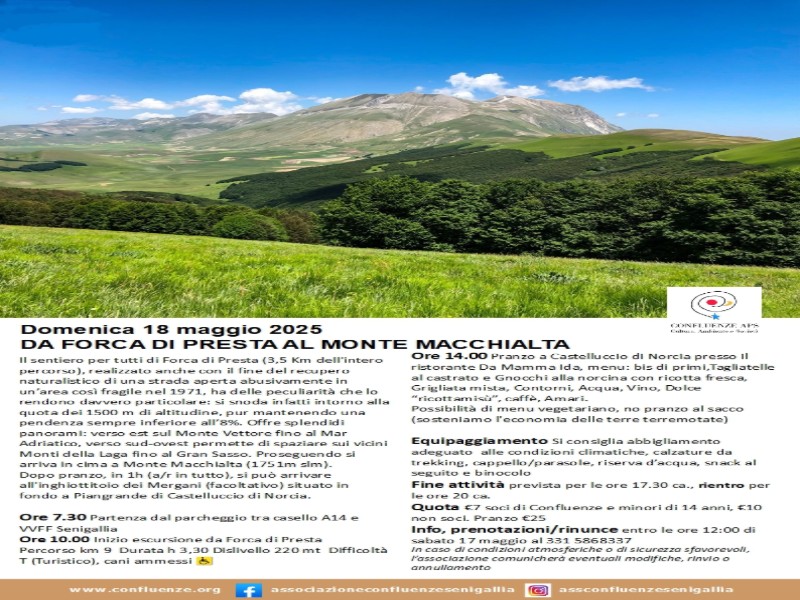 L’associazione Confluenze organizza per Domenica 18 maggio 2025 una facile escursione sui monti Sibillini Da Forca di Presta al Monte Macchialta.