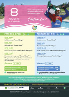 – Percorso a piedi facile di 5/6 km e in bici medio di 35 km su strade bianche e sterrate.