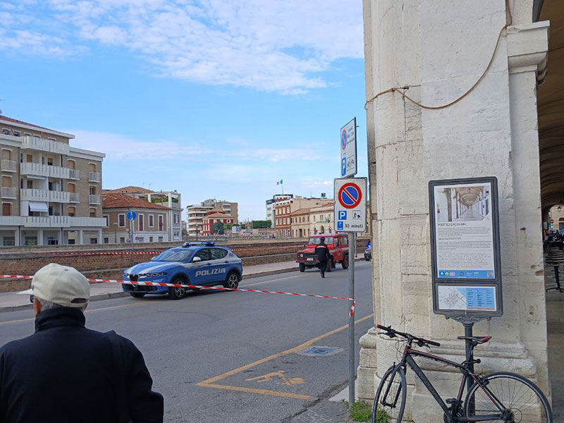 Via Portici Ercolani temporaneamente chiusa al transito in corrispondenza di Palazzo Gherardi, a Senigallia, nel tardo pomeriggio di lunedì 26 maggio. Il motivo è drammatico: il cadavere di una persona è stato segnalato nelle acque del fiume Misa, proprio nel cuore del centro storico.