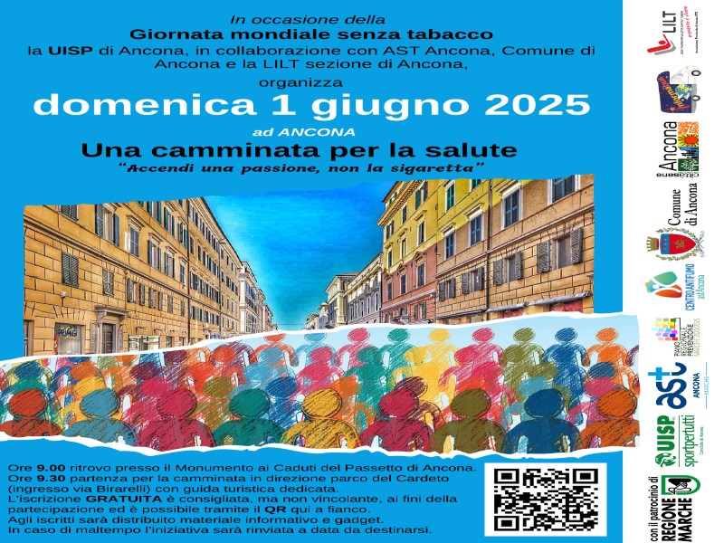 In occasione degli eventi legati alla Giornata Mondiale Senza Tabacco, promossa dall’Organizzazione Mondiale della Sanità, la UISP Comitato di Ancona organizza – in collaborazione con la AST Ancona, il Comune di Ancona Ufficio Promozione della Salute e Rete Città Sane Ancona e la LILT sezione di Ancona – questa iniziativa di promozione dell’attività motoria e dei sani stili di vita, per prevenire e contrastare il tabagismo.