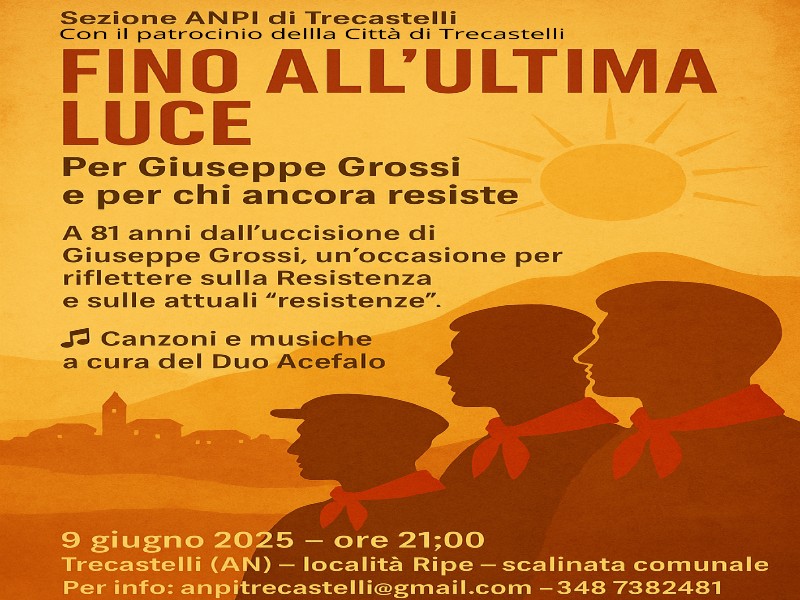 Lunedì 9 giugno 2025, alle ore 21:00, la Sezione ANPI di Trecastelli, con il patrocinio della Città di Trecastelli, organizza la serata commemorativa “Fino all’ultima luce. Per Giuseppe Grossi e per chi ancora resiste”, in memoria del partigiano ripese ucciso 81 anni fa dai nazifascisti.