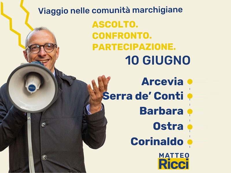 Martedì 10 giugno sarà nuovamente in provincia di Ancona per fare tappa in vari comuni: Arcevia, Serra de’ Conti, Barbara, Ostra e Corinaldo.