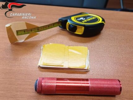 Al suo interno sono stati quindi rinvenuti un metro retrattile modificato con una striscia adesiva sulla punta, nonché numerose strisce di ricambio e una torcia elettrica; strumenti solitamente utilizzati per commettere furti nelle cassette delle offerte dei luoghi di culto, “pescando” dal loro interno ovvero facendo incollare sulla striscia biadesiva monete e banconote.