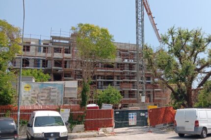 Cantiere edile per edificio residenziale al Vivere VerdeRecentemente, in un’area di dimensioni limitate, è stata realizzata un’opera faraonica di cinque piani, alta quasi 20 metri, affiancata da una palazzina singola, frutto della demolizione di una villa storica a due piani. Questa costruzione altera radicalmente l’aspetto e la qualità della vita nella zona: le abitazioni circostanti si trovano ora soffocate da un vero e proprio “muro” di cemento che riduce drasticamente luce e aria, compromettendo il benessere di chi vive qui da decenni.