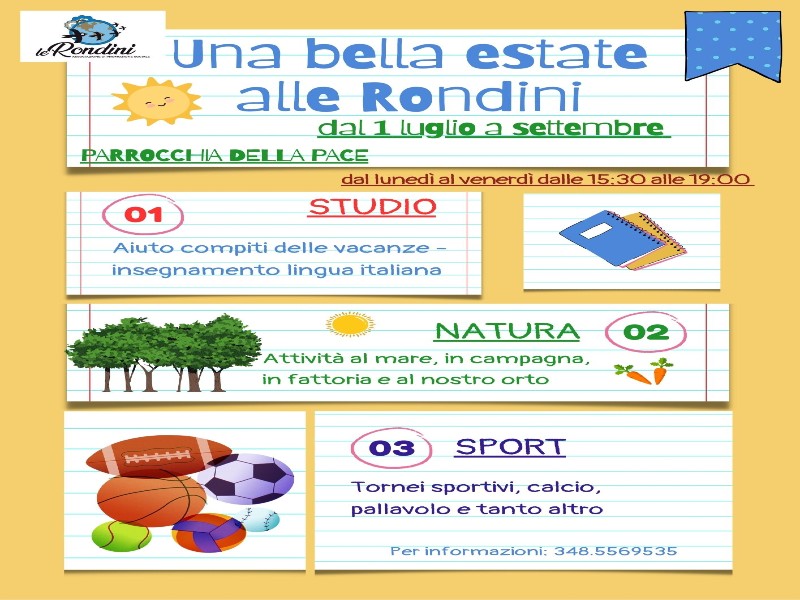 L’associazione Le Rondini ha concluso da poco le attività di sostegno scolastico per supportare i ragazzi negli esami di terza media. Siamo pronti per affrontare la calda estate nell’area esterna della parrocchia della Pace per lo svolgimento dei compiti delle vacanze e per tante avventure proprie del periodo estivo, come uscite nei boschi, in fattorie didattiche, gite, sport e tanto svago.
