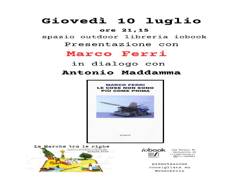 Giovedì 10 luglio alle 21,15 presso la libreria iobook, Marco Ferri presenta “Le cose non sono più come prima” (peQuod 2025) in dialogo con Antonio Maddamma.