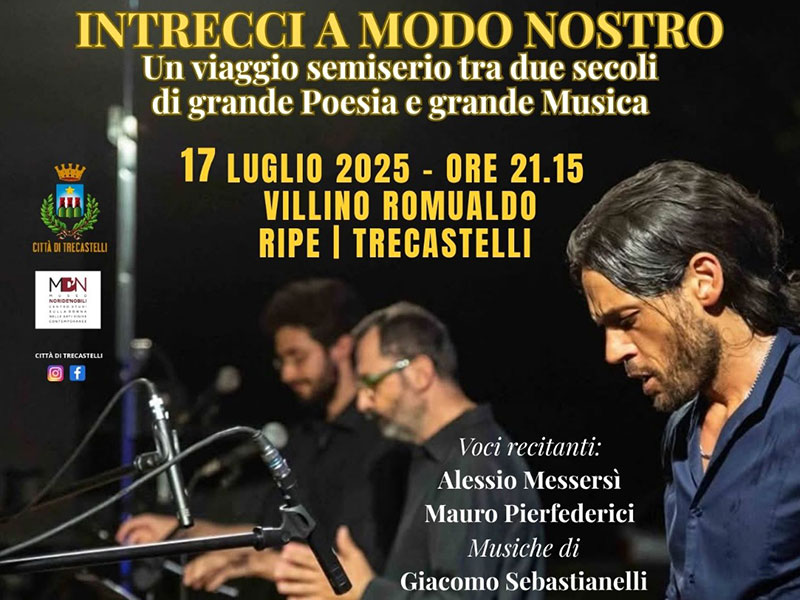 È iniziato il conto alla rovescia a Trecastelli per lo spettacolo “Intrecci a modo nostro – un viaggio semiserio tra due secoli di grande Poesia e grande Musica”, in programma per giovedì 17 luglio, alle ore 21.15, al Villino Romualdo e Museo Nori De’ Nobili.