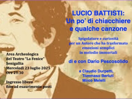 E’ un viaggio musicale ricco di aneddoti e curiosità nel mondo di uno dei più grandi miti della musica leggera italiana, senza cadere nella nostalgia ma concedendosi l’azzardo di qualche rivisitazione e con quel pizzico di ironia che non guasta mai. Mercoledì 23 luglio alle ore 21.30,. Presso l’Area Archeologica del Teatro “La Fenice”, ingresso libero fino ad esaurimento posti.