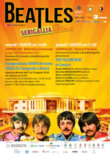 2) Venerdì 01.08.2025 ore 16.00: Corinaldo – Biblioteca Comunale (Largo XVII Settembre 3/5) – Comune di Corinaldo e BeatleSenigallia presentano Inaugurazione CHIEDI chi erano i BEATLES: Fotografie e Rarità (apertura Mostra dal 1 al 10 agosto 2025 ad ingresso gratuito: orario 9.30-12.30 lun/mer/ven, 15.30-18.30 da lun a sab, ven 8/8 e dom 10/8 orario 17.00-19.00 con guida gratuita)