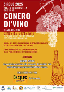 1) Giovedì 31.07.2025 ore 21.00: Sirolo – Piazzetta Arrigo Gugliormella – ProLoco Sirolo Riviera del Conero e Associazione Italiana Sommelier–Delegazione Ancona – SINESTESIE d’ESTATE – BeatleSenigallia in Concert (Paolo Fornaroli voce e chitarra acustica, Matteo Pirani chitarra solista e Paolo Molinelli voce narrante)